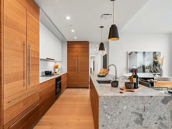 Kitchen is outfitted with Raw Concrete Caesarstone countertops, light walnut and grey lacquered cabinetry, custom full-height pantry and a suite of Miele appliances. Luxurious master bathrooms feature Pelle Grigio marble wall tile, Basalt grey stone flooring, and a spa-like, glass-enclosed shower. Secondary baths feature Progetto white matte ceramic wall tile paired with Strada Rain porcelain flooring and an alcove bathtub. Each bathroom is finished with a Toto toilet and Dornbracht polished chrome fixtures.